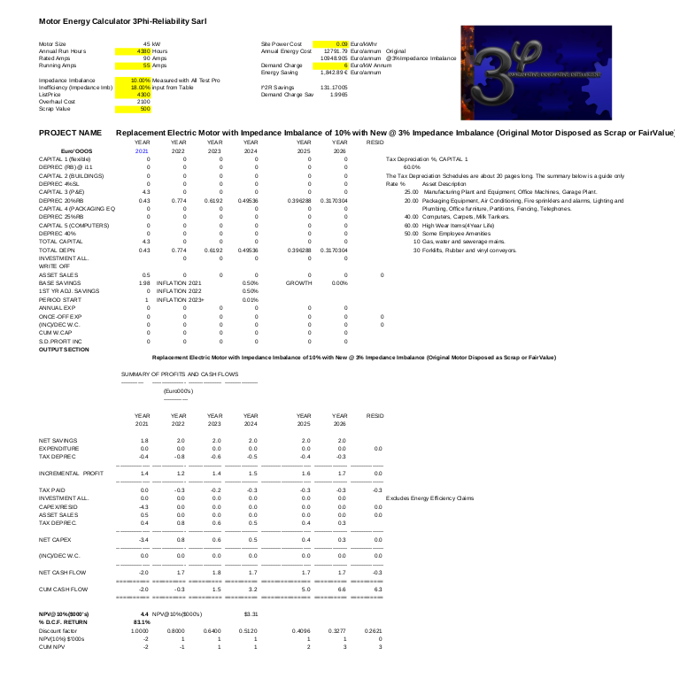 Conduct a Motor Test and Calculate what the inefficiency is, then with the help of the 3Phi Energy Calculator create a financial justification within minutes.
